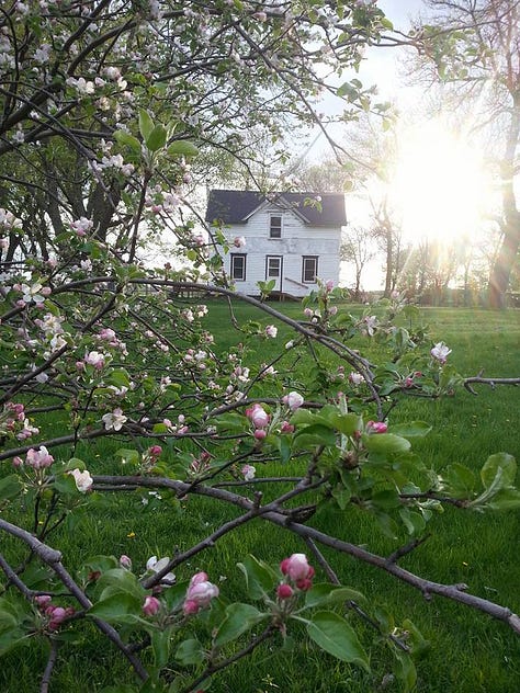 Last fall I wrote about the day we first set foot here on this particular piece of prairie. Greeted so merrily by apple trees, we planted two more our first spring. We discovered asparagus on the southwest hillside, overlooking the garden which previous residents had fruitfully tended. Lilacs, tulips, irises, lilies, clematis, and phlox were scattered all around the property. Our catalog of trees includes silver maple, juniper cedar, quaking aspen, crabapple, ash, walnut, linden, boxelder. The arbor vitae we’ve replaced with pines. Every May the cherry and apple trees burst incandescent and startle us speechless with their breathtaking creme puff wedding dresses.