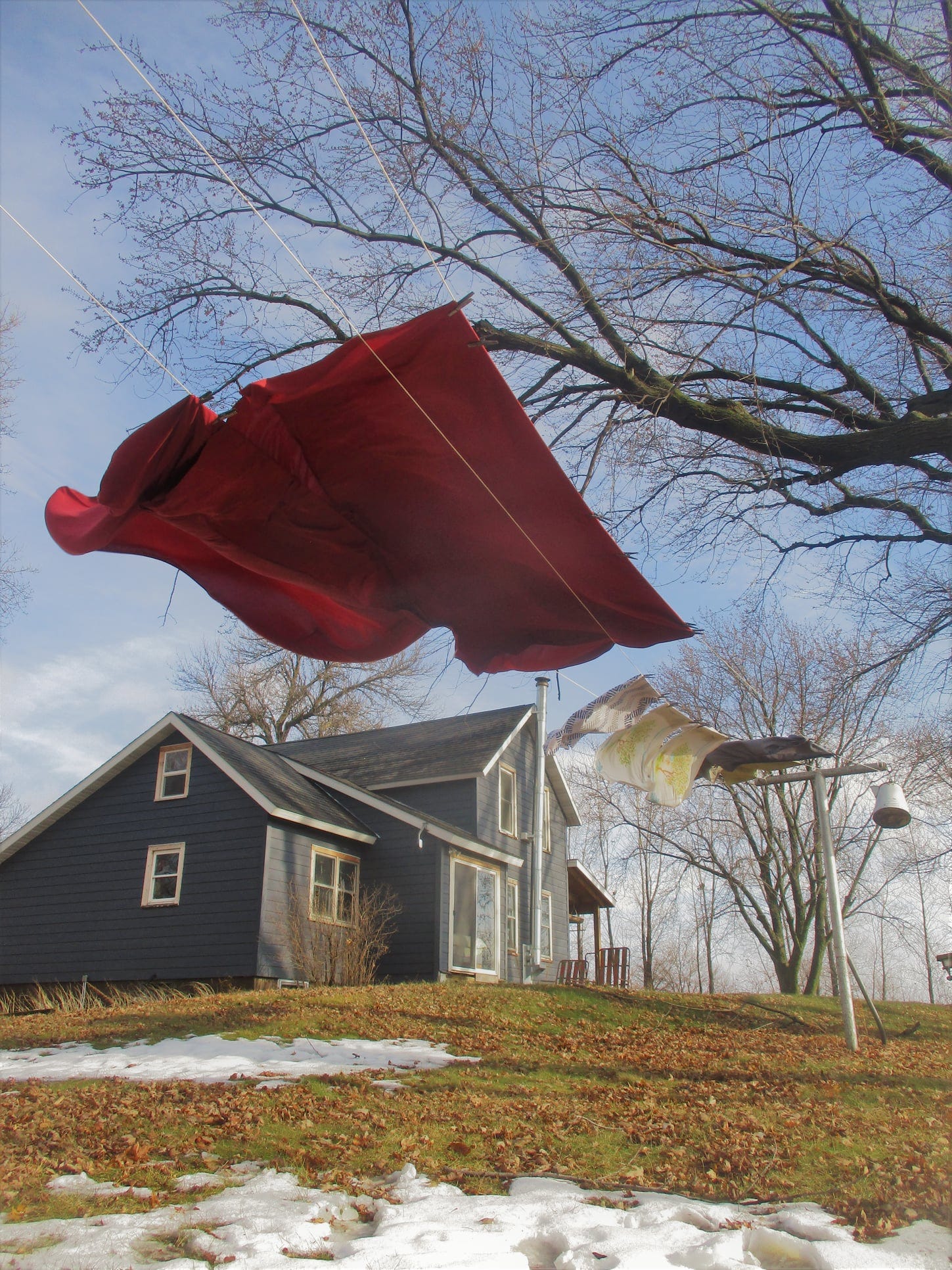 That winter term sank into me. The Manor House, Indian curries, chais, hearthfires, footpaths, pubs, and evensongs. Now I carry it all with me, dousing spores on everything I make here on the prairie. I hang our laundry on the collapsible kitchen rack, and above the stairs, and when the sun comes out, I string bedsheets on the clothesline overlooking the sunken garden.