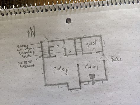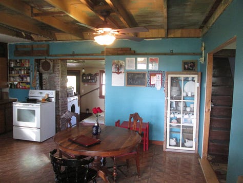 Our ground floor layout is comprised of three rooms: library, guestroom, galley. The galley is a spacious, unorthodox area that includes two porch or lean-to alcoves that were built on to the house and eventually enclosed. One offshoot is split into an entryway, laundry closet, and small bathroom (happily leaving the outhouse era behind). The other is an office nook with a sliding glass door that used to open out to a deck before the planks rotted away. We haven’t rebuilt it yet so for now the doors serve as a pretty window. We hung mirrors on the opposite wall to bring in as much light as possible, but even so the galley is usually the coolest, shadiest room since the Jotul keeps the library cozy.