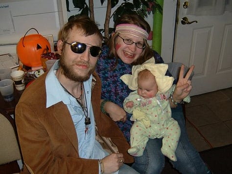 You’re at an anime con (convention) this weekend. Your first costume was a starflower. Starflower comes from your name. Elanor is a made-up word with a made-up meaning, the invention of JRR Tolkien. In one of his elvish languages, it’s the name for a small silver or gold flower that catches the light of the sun and stars. Your name means “the light of stars.” For that first Halloween as a family of three, Papa put on a pair of sunglasses, I wore bell bottoms, and you were our flower child. I sewed a little felt hood in the shape of yellowy petals and painted rosy circles on your cheeks.