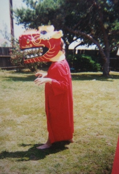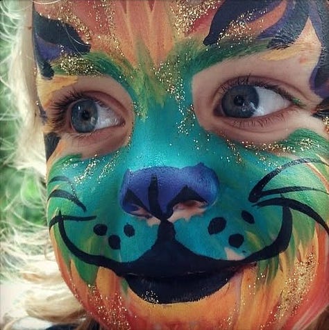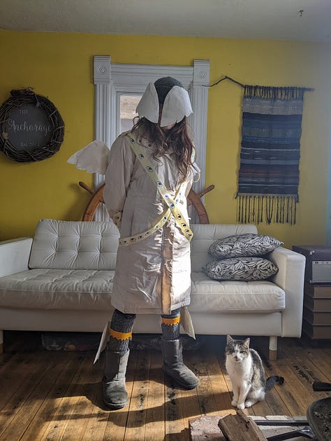 But I didn’t just want to wear costumes, I felt compelled to fashion them, to paper mache headpieces and stitch fabric wings. In college theatre productions I chicken-wired a boulder, sculpted a fruit-laden hat, facepainted wrinkles, and shoe polished hair. Why do we make masks? Why do we make believe? Not to hide, but to seek. How else would we try on traits we cannot access otherwise, practice potential futures, act out what we admire or abhor? We test out being treated like a hero or villain, a monster, a clown, or a rare endangered marsupial. We put on a persona and look through her eyeholes, familiarizing ourselves with specific strengths and weaknesses, needs and abilities, fears and desires. We clothe our bodies in armor or rags. We slip strange shoes onto our feet and step into the motion of an unfamiliar song. Are we scary? Beautiful? Funny? Yes and yes and yes, we are. We are winners and losers, emperors and fools. Each form we inhabit leaves traces on our skin, on our psyche. Underneath our capes and gowns and cardboard cutouts we become what we pretend to be.