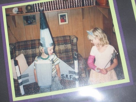Over the ensuing years your costumes have stemmed more and more from your own creativity and less and less from your parents’. You’ve been a Tawny Scrawny Lion and Princess Batman, a rainbow tiger and a spotted bat and a semi-biblically-accurate angel, (Cru)Ella and Envy. When I was a kid I was an onion in my family’s Rabbit Stew Parade, so you can be grateful to’ve escaped that fate. I loved cosplay almost as much as you and your Aunt Lauren, although I just called it dress up. Every kid knew about dress up clothes, a closet or chest heaped with outlandish styles and assorted career accessories—bonnets, bandanas, petticoats, pantaloons, helmets, holsters, handcuffs, a slate, a stethoscope, an apron, an eyepatch. Perhaps our interest in inward qualities draws us to imaginary roles over ordinary occupations. As a teen I dressed up as Eowyn and Eponine, characters known for their fearlessness and yearning. After my wedding I stored away my wool cloak just in case some need arose. On my honeymoon I faced a difficult choice between two souvenirs: Jack Sparrow’s tricorner or Indiana Jones’ fedora? (Which would you choose?)